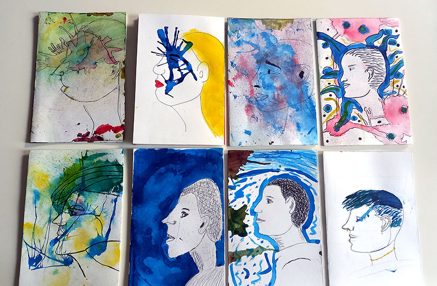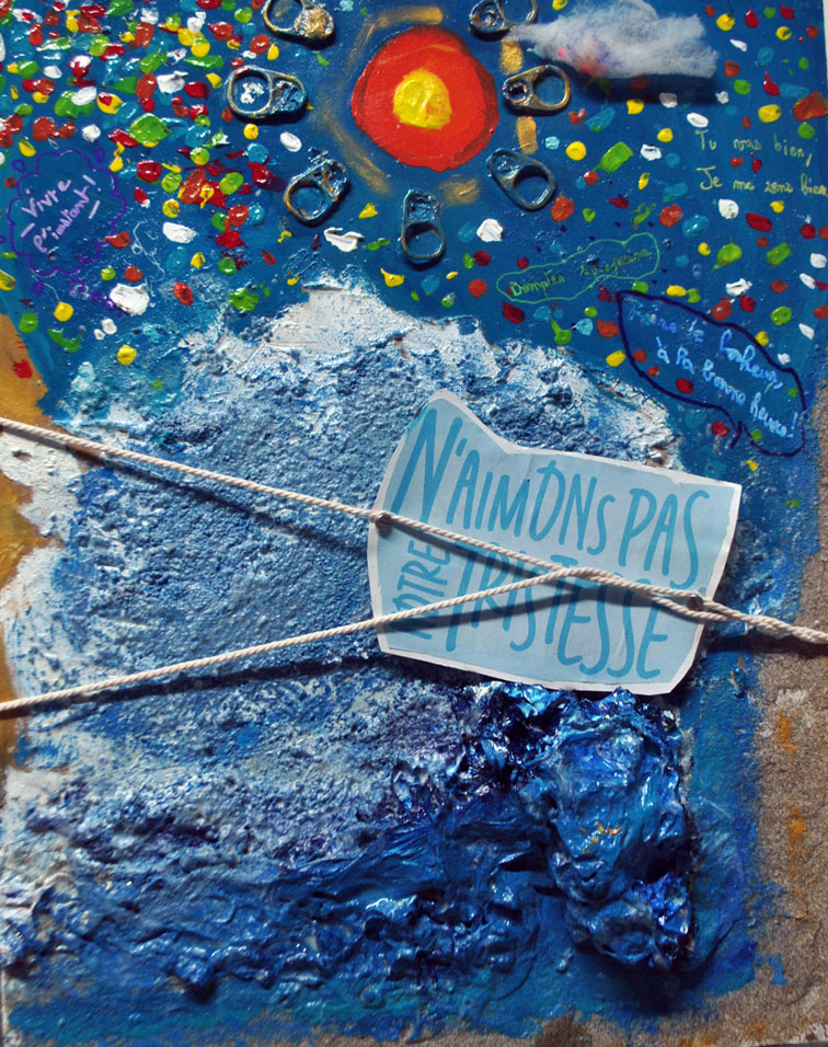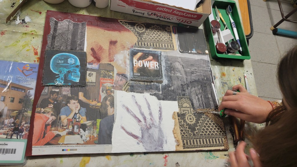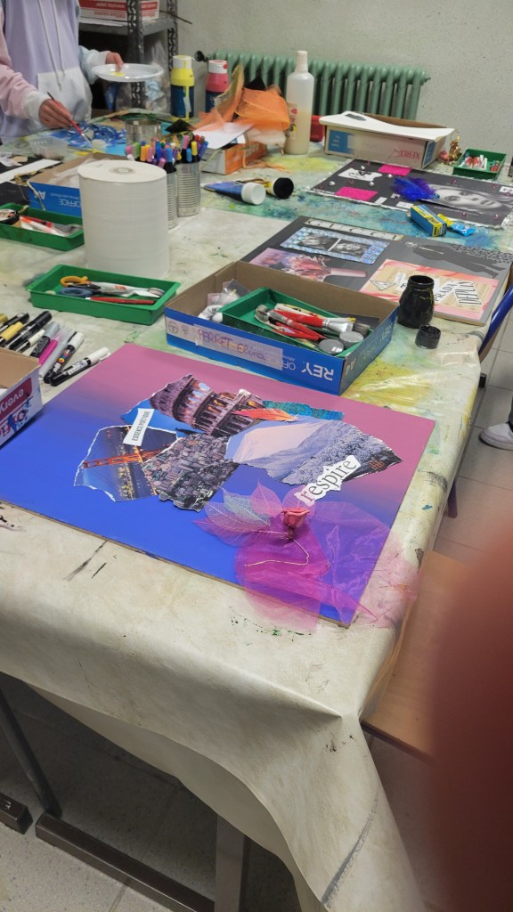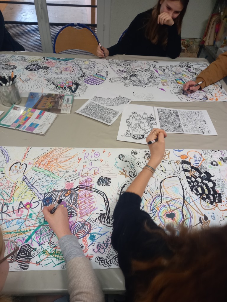 En petit groupe, les adolescents explorent les couleurs, les formes et les textures pour dire autrement ce qu’ils ressentent.